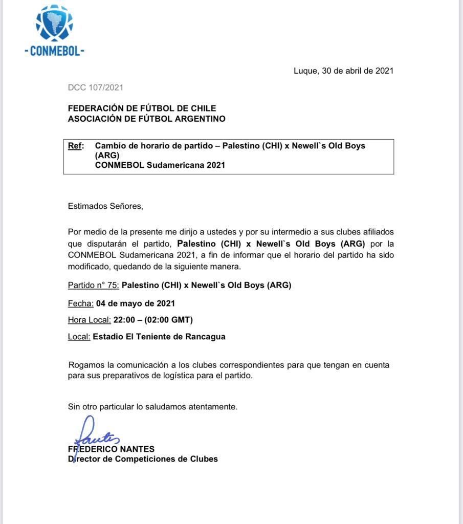 El ente que preside el paraguayo Alejandro Domínguez decidió correr el encuentro a disputarse en Chile entre Newell’s y Palestino por la tercera fecha de la Copa Sudamericana. Esta decisión se dio en el marco del cambio de horario para el partido entre los rosarinos contra Rosario Central.