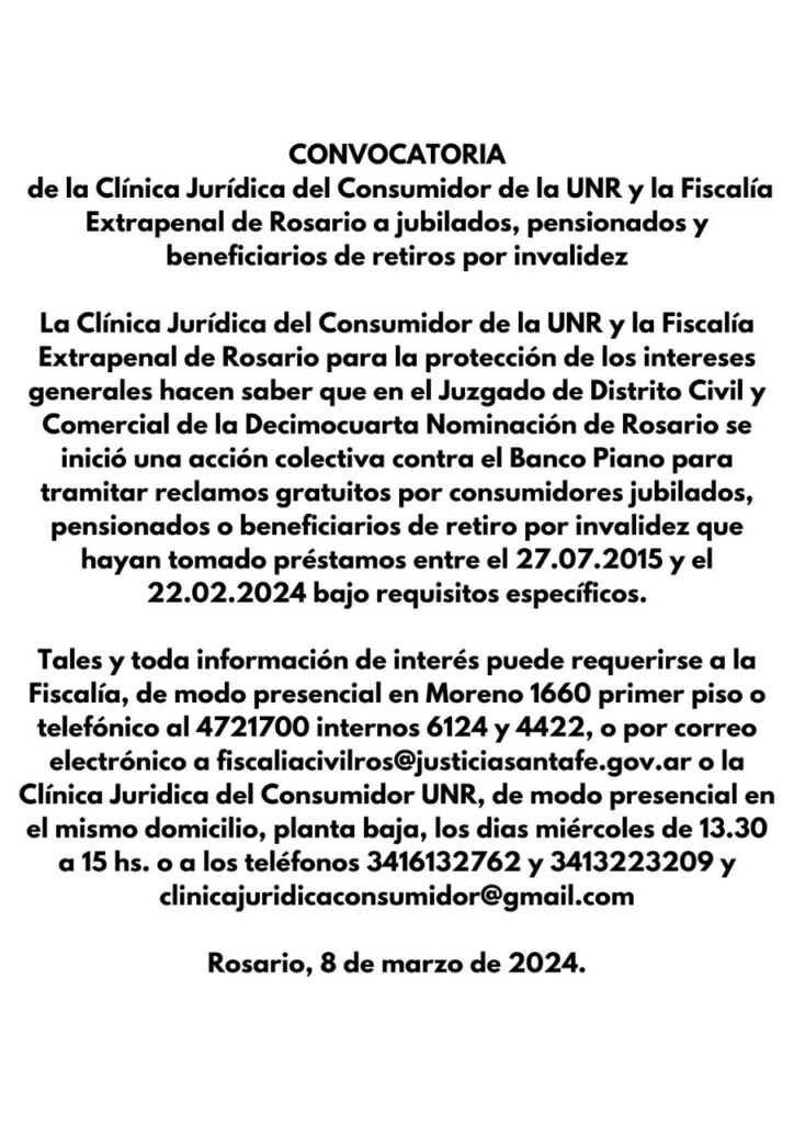 A través de un comunicado, manifestaron: “Hacen saber que en el Juzgado del Distrito Civil y comercial de la DecimocuartaNomincaión de ROsario, se inició una acción colectiva contra el Banco Piano para tramitar reclamos gratuitos por consumidores jubilados, pensionados o beneficiarios de retiro por invalidez que ayan tomado prestamos entre el 27 de julio del 2015 y el 22 de febrero de 2024 bajo requisistos específicos.