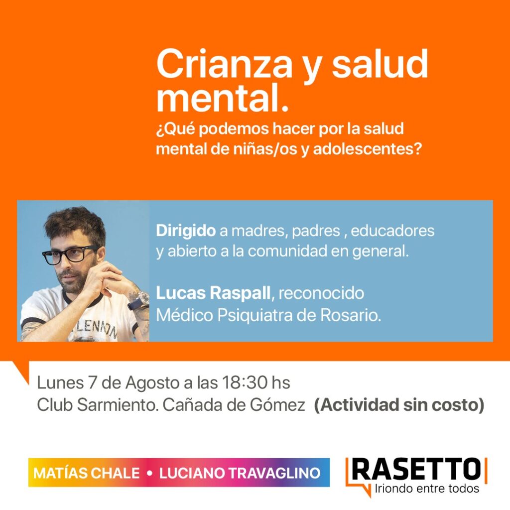 La misma será en el Club Sarmiento, encabezada por el reconocido médico psiquiatra de la ciudad de Rosario, el Dr Lucas Raspall. Para quienes deseen asistir la entrada será totalmente gratuita y es para todas las personas. La iniciativa la llevan adelante los concejales de la ciudad: Luciano Travaglio y Matías Chale.