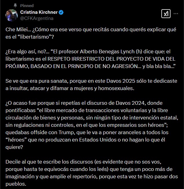 “Che Milei… ¿Cómo era ese verso que recitás cuando querés explicar qué es el ‘libertarismo’?”, ironizó Cristina, aludiendo a las referencias del presidente al economista Alberto Benegas Lynch (h). “Se ve que era pura sanata, porque en este Davos 2025 solo te dedicaste a insultar, atacar y difamar a mujeres y homosexuales”, agregó.