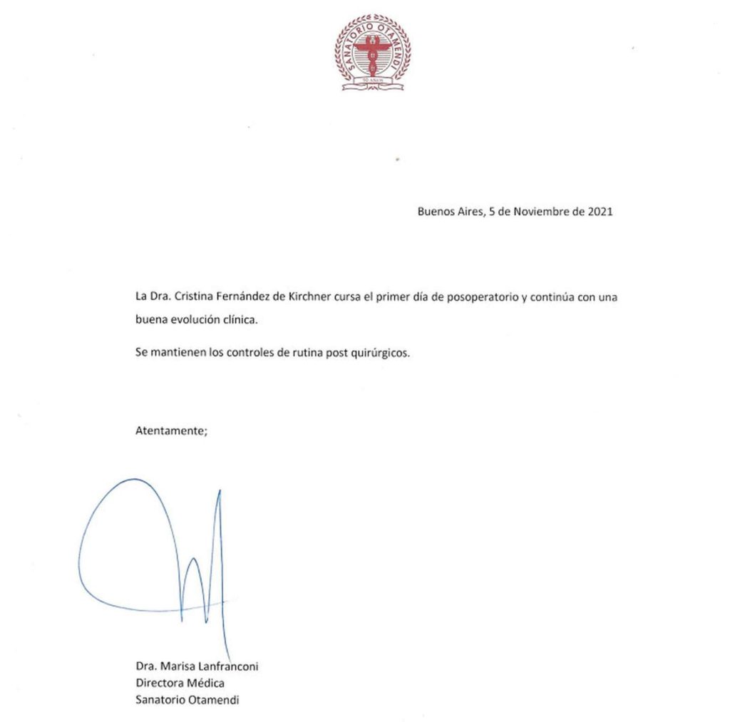 El parte que emitió el cuerpo médico aclara que la vicepresidenta continuará internada. “La Dra. Cristina Fernández de Kirchner cursa el primer día de posoperatorio y continúa con una buena evolución clínica. Se mantienen los controles de rutina post quirúrgicos”, se lee en el texto.