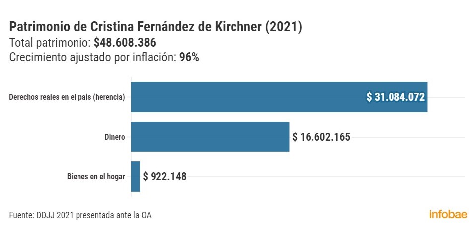Correspondiente al período 2021, en su declaración jurada anual informó un patrimonio de $48.608.385. El monto representa un 195% más de lo que había declarado en el 2020 en términos nominales, cuando había informado $16.463.095. Si se considera la inflación del 50,9% que hubo en 2021, el aumento real fue del 96%.