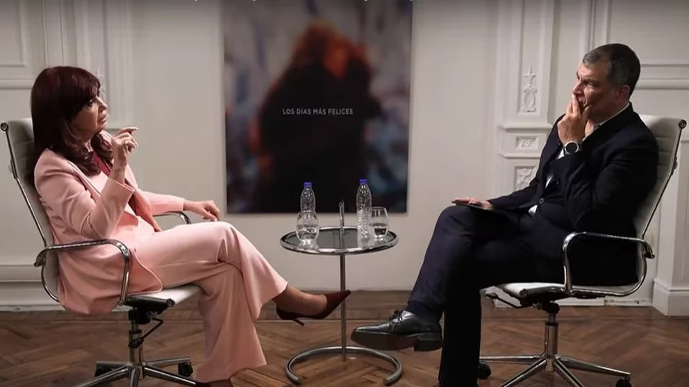 En una entrevista con Rafel Correa, ex presidente de Ecuador, la vicepresidenta habló sobre la situación política, la justicia y el Fondo Monetario Internacional. Sin embargo, también se refirió a sus posiciones históricas respecto de la responsabilidad de los gobiernos dictatoriales en la caída de la economía.