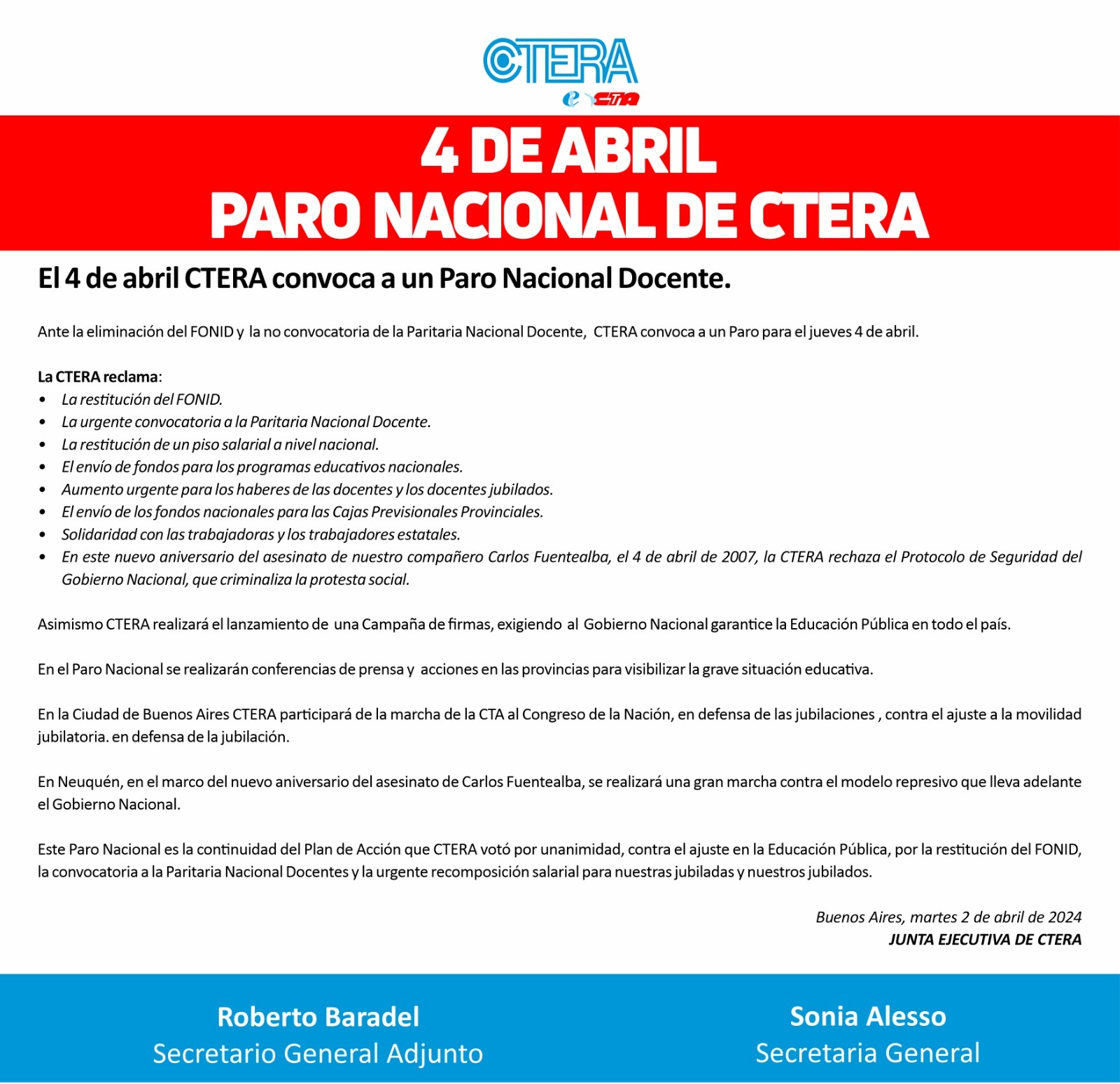 La Central de Trabajadores de la Educación de la República Argentina (CETRA) anunció un paro nacional docente para el próximo jueves 4 de abril.