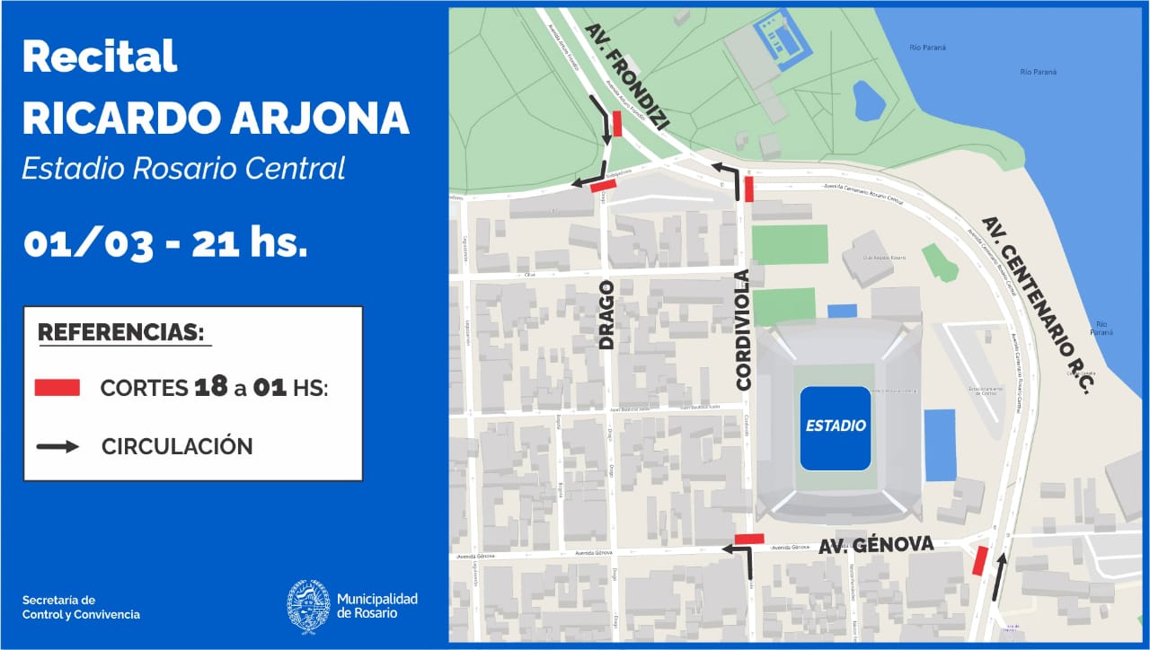 Con motivo del recital de Ricardo Arjona, dispuesto para esta noche, la Municipalidad dispuso cortes y ordenamiento de tránsito. Los cortes de tránsito comenzarán a las 18 hs y concluirán una vez finalizado el evento.