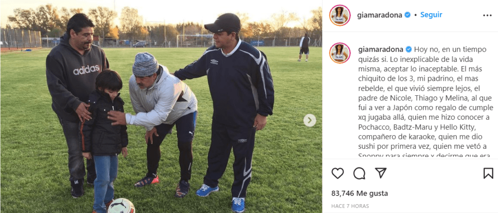 Por su parte, la ex de Sergio Agüero, que además es ahijada de Hugo, publicó un extenso texto despidiendo a su padrino. “Hoy no, en un tiempo quizás si. Lo inexplicable de la vida misma, aceptar lo inaceptable. El más chiquito de los 3, mi padrino, el mas rebelde, el que vivió siempre lejos, el padre de Nicole, Thiago y Melina (…) quien me vetó a Snoppy para siempre x decirme que era mufa, el peleador mas peleón si me veía con un chabón. Me guardo haber compartido tanto (SIC)”, comenzó.