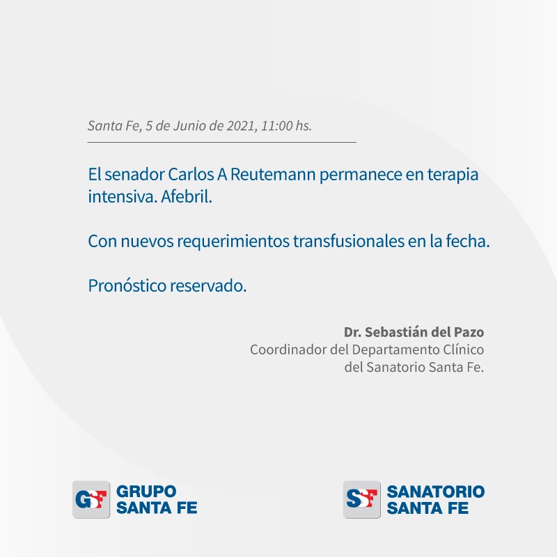 El senador Carlos Reutemann continúa internado en terapia intensiva con pronóstico reservado. Según el último parte médico difundido este sábado, el ex gobernador se encuentra sin fiebre pero “con nuevos requerimientos transfusionales”.