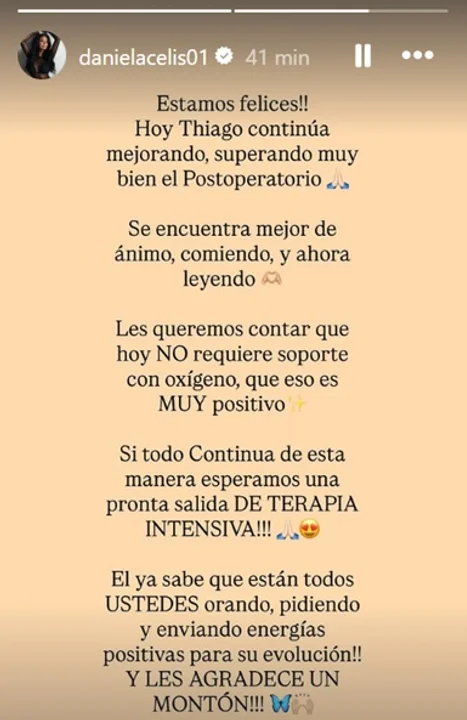“Él ya sabe que están todos ustedes orando, pidiendo y enviando energías positivas para su evolución. Y les agradece un montón”, concluyó Daniela Celis.
