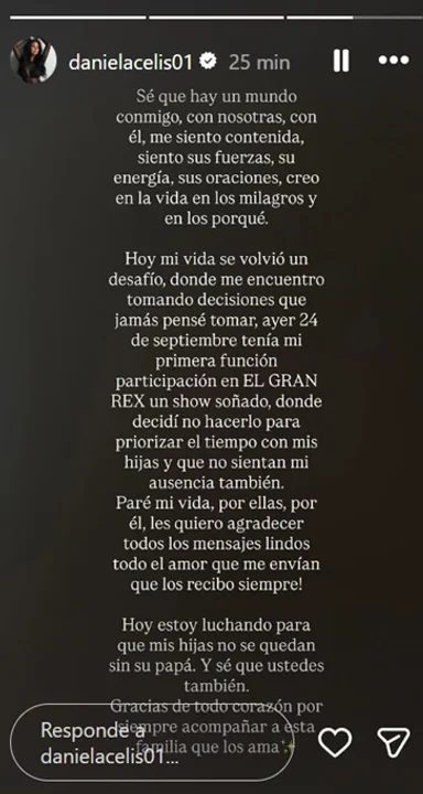 Daniela dejó sus obligaciones laborales de lado para estar junto a sus pequeñas hijas, Laia y Aimé: “Paré mi vida por ellas, por él. Les quiero agradecer todos los mensajes lindos, todo el amor que me envían, que los recibo siempre.. Hoy estoy luchando para que mis hijas no se queden sin su papá. Y sé que ustedes también. Gracias de todo corazón por siempre acompañar a esta familia que los ama”.
