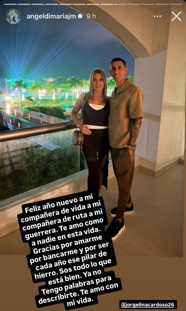 Por su parte, Ángel Di María mostró en su cuenta personal de instagram una foto con su pareja y escribió un lindo mensaje para ella: “Feliz año nuevo a mi compañera de vida a mi compañera de ruta a mi guerrera. Te amo como a nadie en esta vida. Gracias por amarme por bancarme y por ser cada año ese pilar de hierro. Sos todo lo que está bien. Ya no tengo palabras para describirte. Te amo con mi vida”.