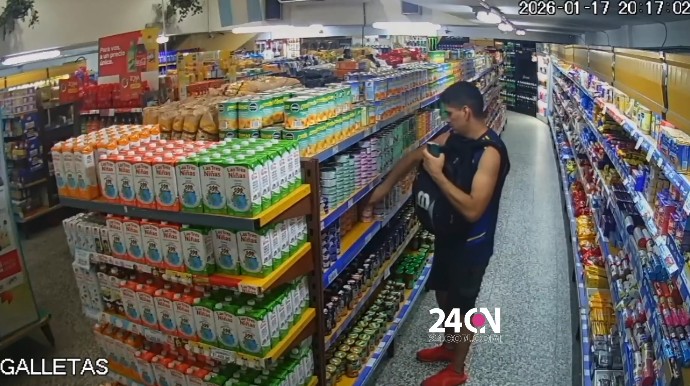 Ya dentro del local, el joven se dirigió directamente a la góndola de enlatados y comenzó a guardar una lata tras otra dentro de la mochila. En un momento, al advertir que otro cliente lo observaba con atención, se puso nervioso y una de las latas cayó al piso, aunque logró recomponerse y continuar con la maniobra.
