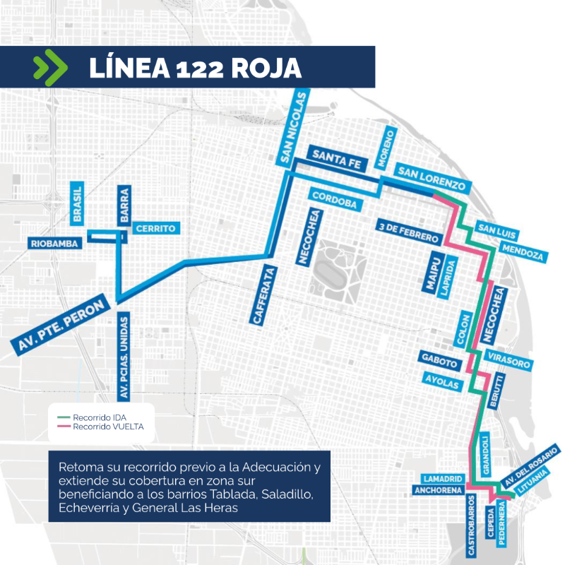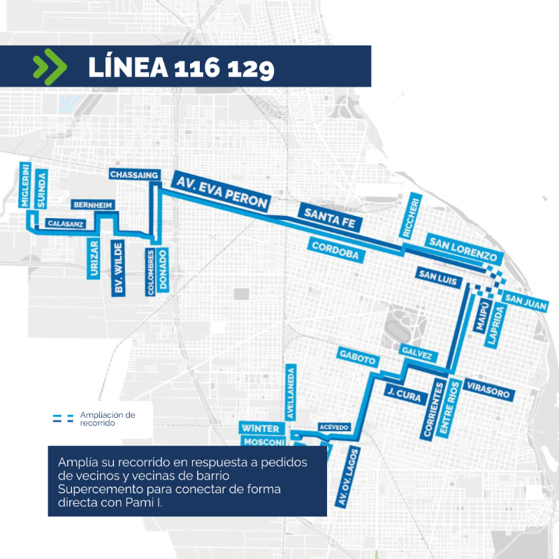Las líneas 116-129 extenderán su recorrido en respuesta a pedidos de vecinos y vecinas de barrio Supercemento para conectar de forma directa con Pami I. Por otro lado, se eliminará la fusión de las líneas 122 Roja y 127, “con el objetivo de mejorar la conectividad, retomando parte de su recorrido habitual previo a la implementación de la Adecuación”.