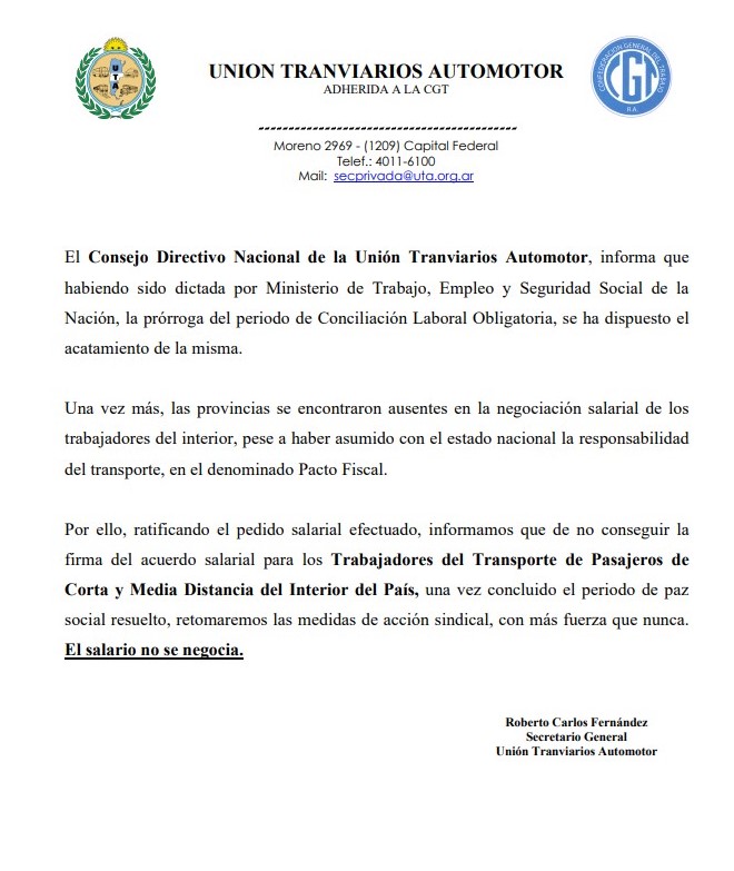 Paralelamente, el gremio lanzó un comunicado: “El Consejo Directivo Nacional de la Unión Tranviarios Automotor, informa que habiendo sido dictada por Ministerio de Trabajo, Empleo y Seguridad Social de la Nación, la prórroga del periodo de Conciliación Laboral Obligatoria, se ha dispuesto el acatamiento de la misma”.