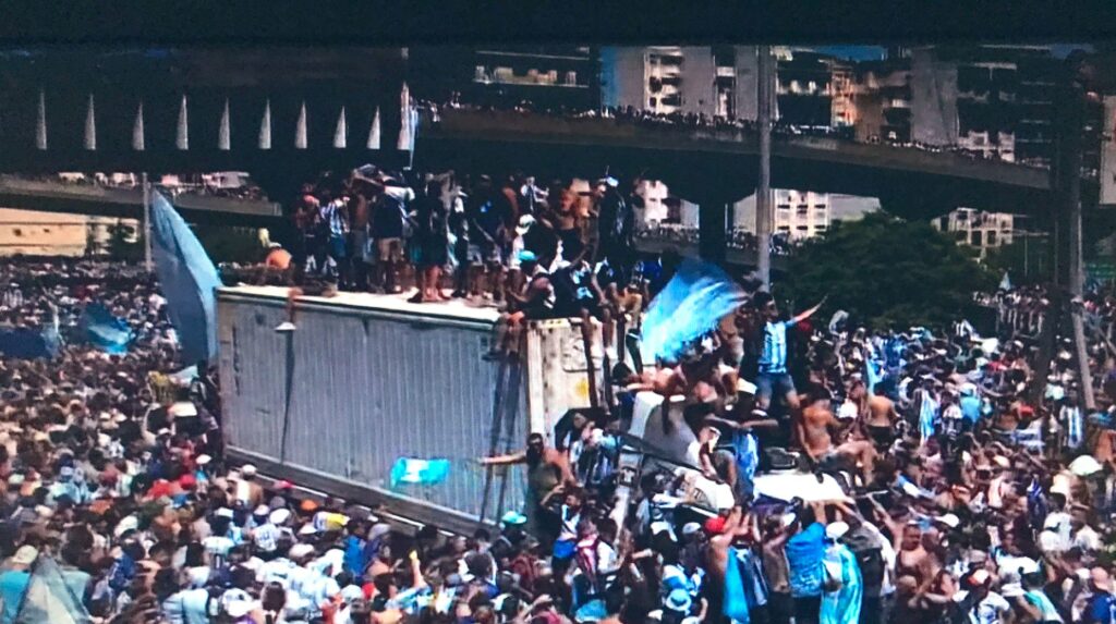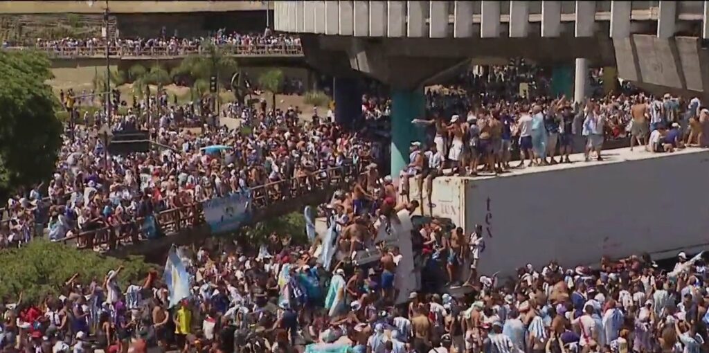 Varias personas se treparon a un camión que circulaba por la Autopista 25 de Mayo en la provincia de Buenos Aires, mientras miles de fanáticos aguardaban por los campeones del Mundo.
