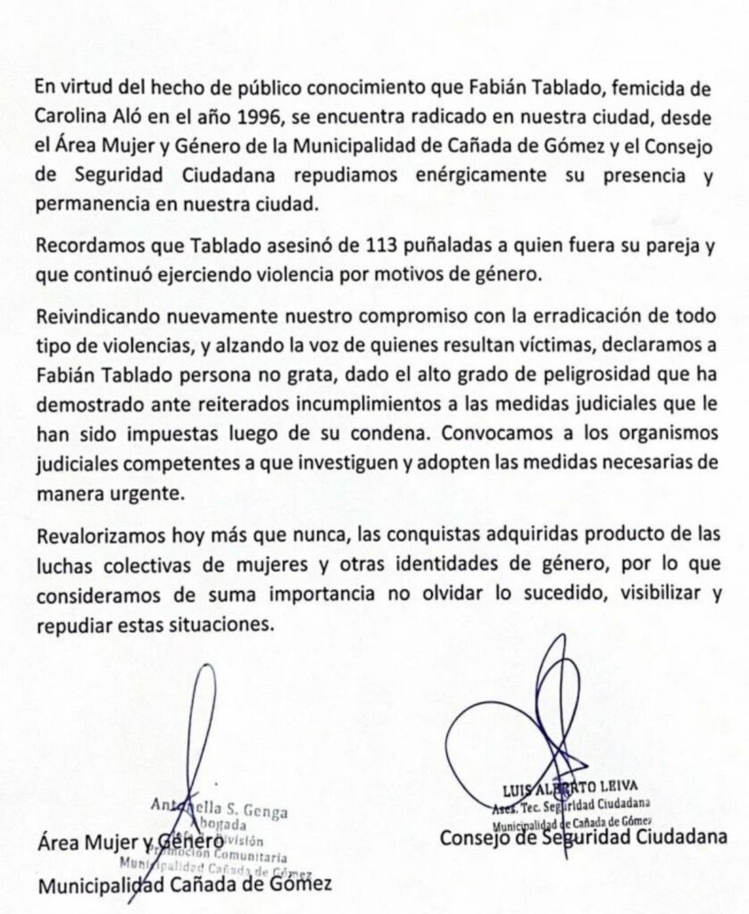 “En virtud del hecho de público conocimiento que Fabián Tablado, asesino de Carolina Aló en el año 1996, se encuentra radicado en nuestra ciudad, desde el Área Mujer y Género de la Municipalidad de Cañada de Gómez y el Consejo de Seguridad Ciudadana repudiamos enérgicamente su presencia y permanencia en nuestra ciudad”, explicaron a través del informe emitido.