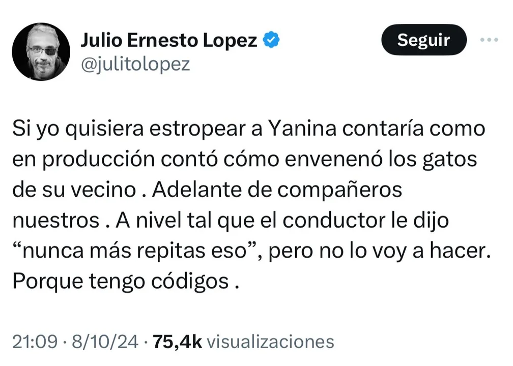 “Si yo quisiera estropear a Yanina, contaría como en producción contó cómo envenenó a los gatos de su vecino. Adelante de compañeros nuestros. A nivel tal que el conductor le dijo ”nunca más repitas eso”, pero no lo voy a hacer. Porque tengo códigos”, dijo irónico.