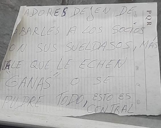 En una hoja de papel, y escrito a mano con una birome negra, el mensaje reza: “Jugadores dejen de robarles a los socios con sus sueldasos, más vale que le echen “ganas” o se pudre todo, esto es Central” (SIC).