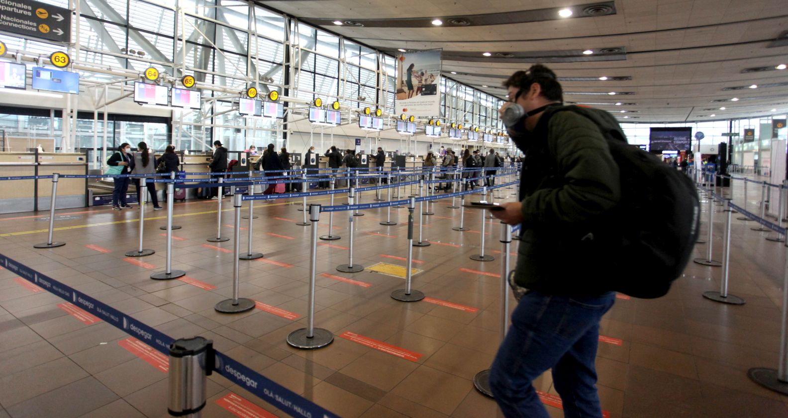 Persona transita por el lugar tras el control sanitario en el interior del Aeropuerto Arturo Merino Benitez, ubicado en la comuna de Pudahuel, Santiago.
