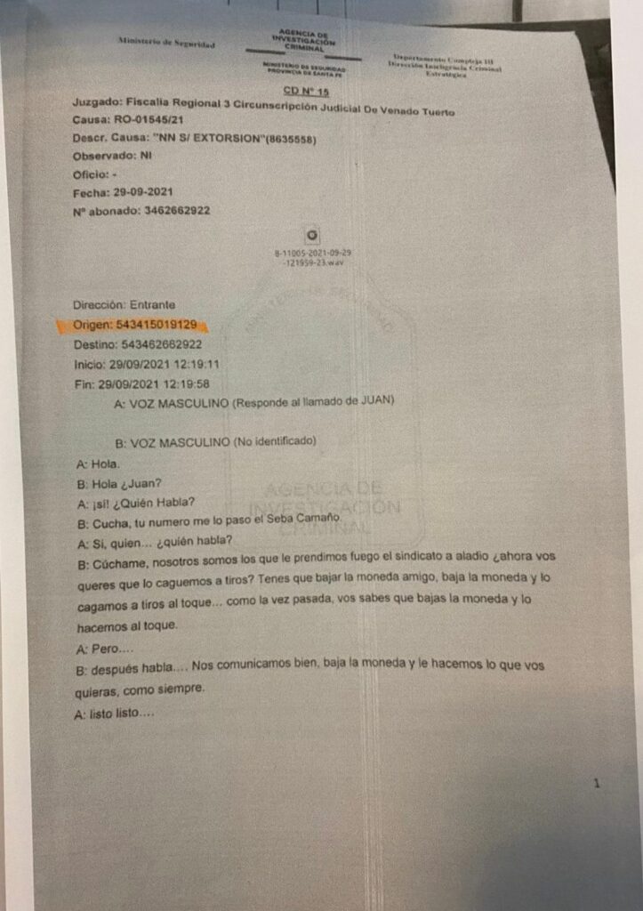 -Cuchame. Nosotros somos los que prendimos fuego al sindicato de Aladio. ¿Ahora vos querés que lo caguemos a tiros? Tenés que bajar la moneda amigo, bajá la moneda y lo cagamos a tiros al toque… como la vez pasada, vos sabés que bajás la moneda y lo hacemos al toque.