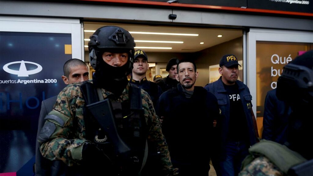 Escoltado por personal de Interpol Argentina, “Dumbo” Maylli Rivera llegó esposado en un vuelo de la empresa Latam que tocó tierra después de las 18 en el Aeropuerto Internacional de Ezeiza, y desde allí será llevado bajo un fuerte operativo de seguridad a la alcaidía de la Superintendencia de Drogas Peligrosas de la Policía Federal Argentina, donde aguardará ser indagado por el juez federal número 11 Julián Ercolini.