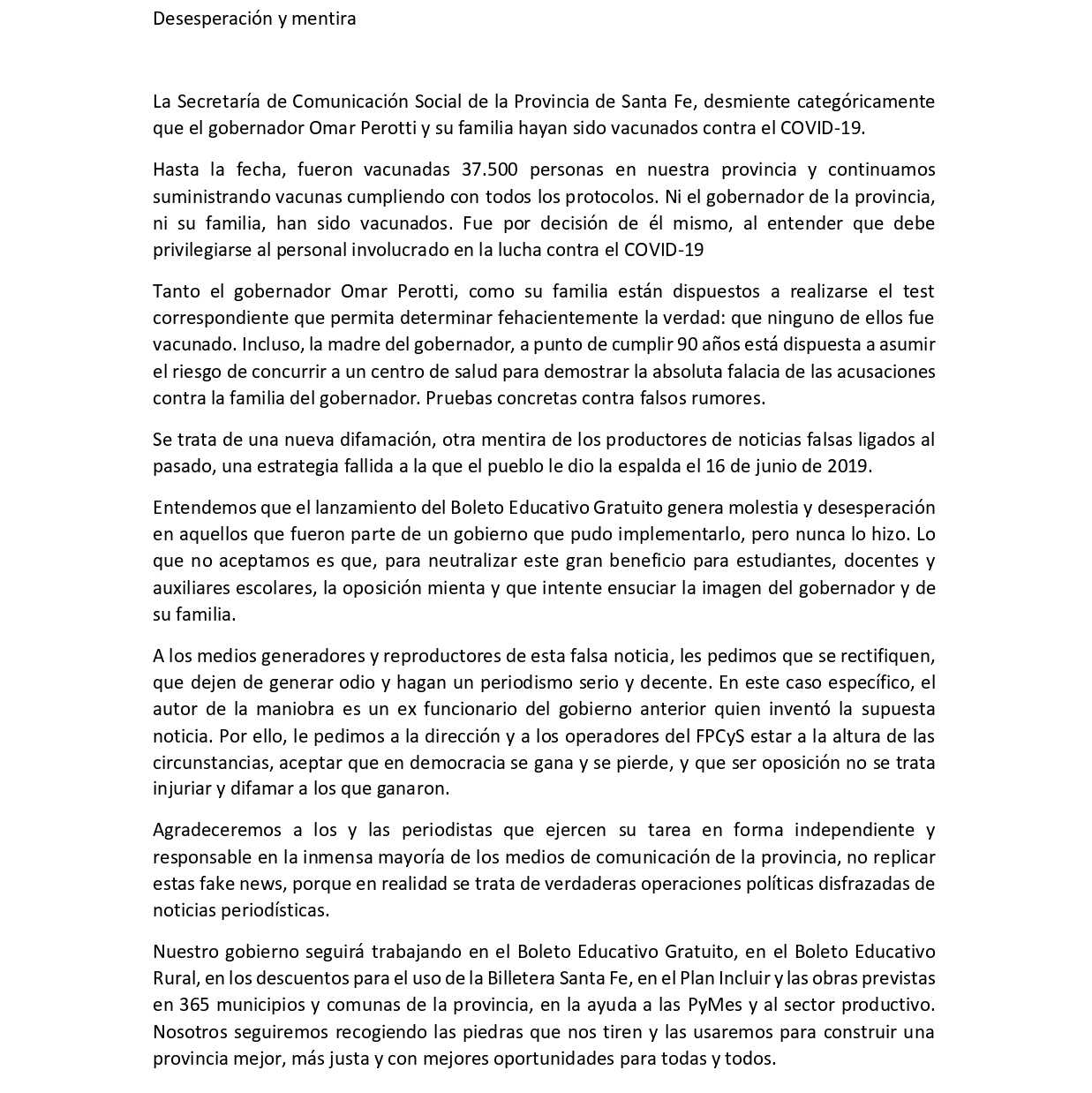 El texto, que se difundió en la tarde de este sábado, señala que “tanto el gobernador Omar Perotti, como su familia están dispuestos a realizarse el test correspondiente que permita determinar fehacientemente la verdad: que ninguno de ellos fue vacunado. Incluso, la madre del gobernador, a punto de cumplir 90 años está dispuesta a asumir el riesgo de concurrir a un centro de salud para demostrar la absoluta falacia de las acusaciones contra la familia del gobernador. Pruebas concretas contra falsos rumores”.
