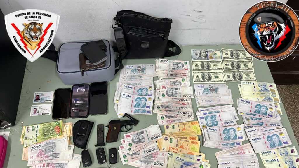 Durante la requisa del vehículo, los efectivos encontraron una pistola Taurus calibre 25 con cargador y cinco balas, además de 600 dólares, $1.765.500 en efectivo y tres teléfonos celulares iPhone.