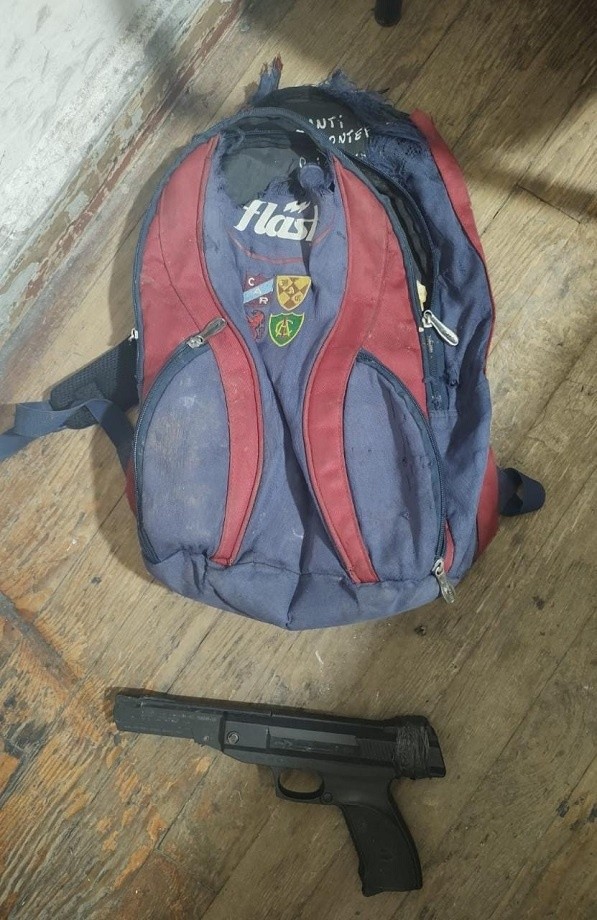 Además, tenían en su poder una réplica de un arma de fuego que simulaba ser una pistola calibre 4.5 mm, con piezas de plástico y metal y un largo de unos 30 cm.