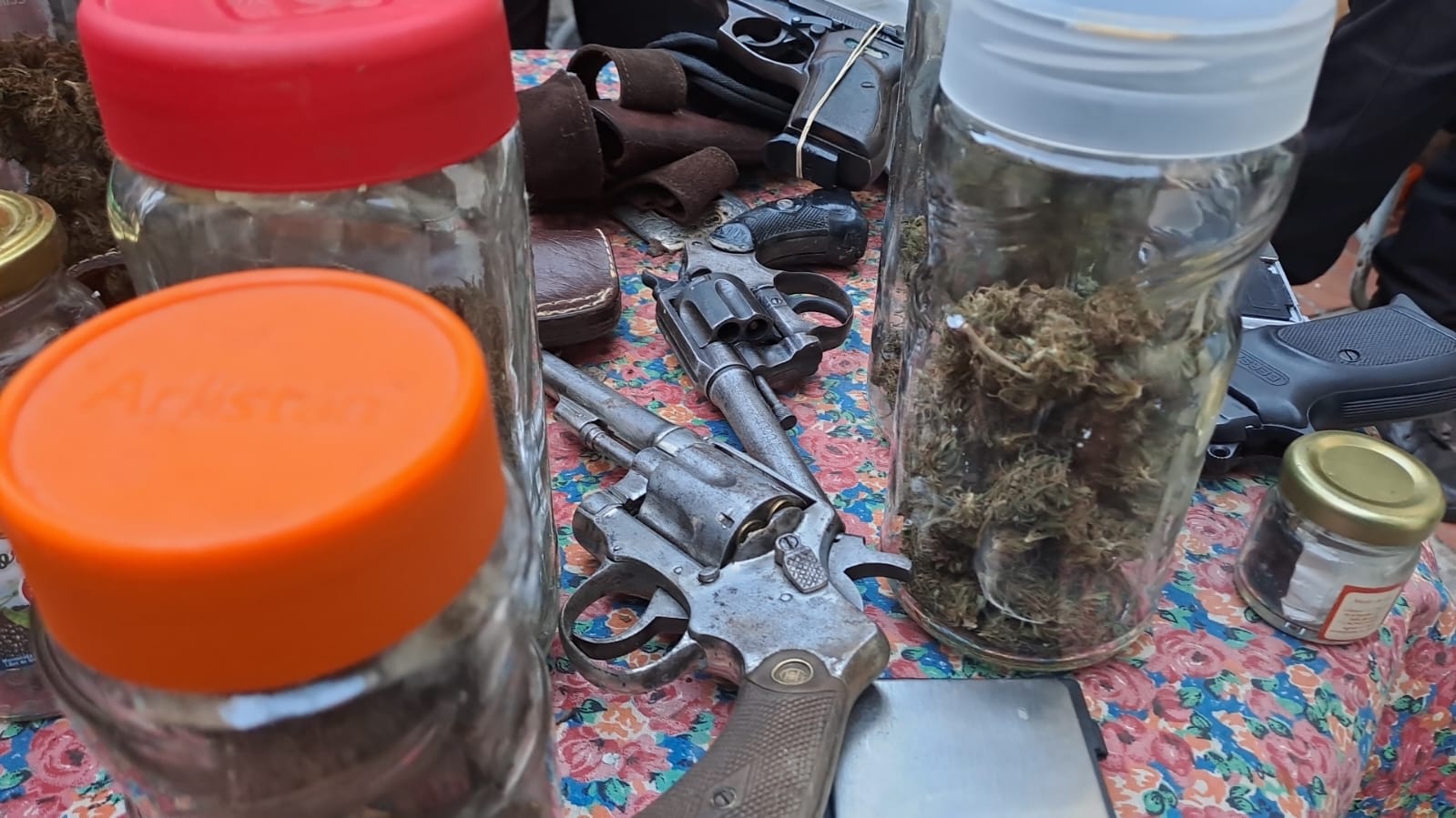 En el interior de la casa la policía secuestró dos pistolas, dos revólveres y frascos con marihuana.