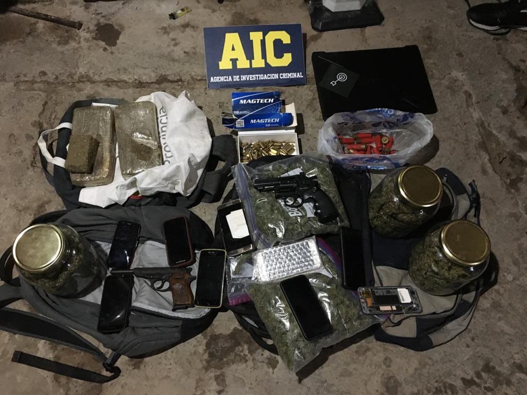 Entre el armamento, efectivos de la Agencia de Investigación Criminal se encontraron con un arma calibre 22, una pistola replica, 83 municiones de diferentes calibres y una escopeta junto a más de 70 balas de la misma. Por otro lado, los policías secuestraron cuatro teléfonos celulares y material estupefaciente, correspondiente a tres trozos compactos de marihuana. Además, la misma se encontraba guardada en frascos y bolsas, y pesaban aproximadamente 3 kilogramos.