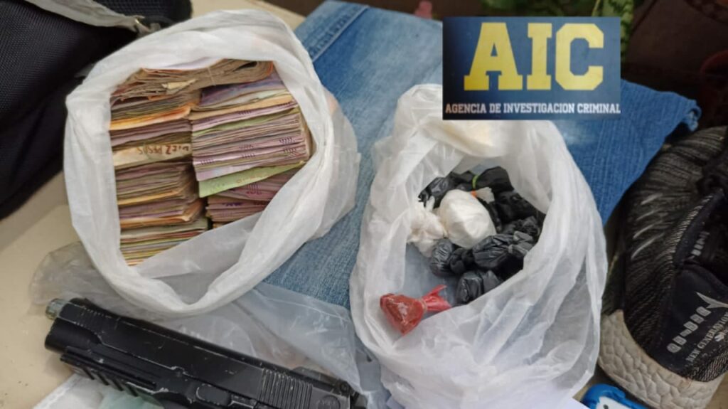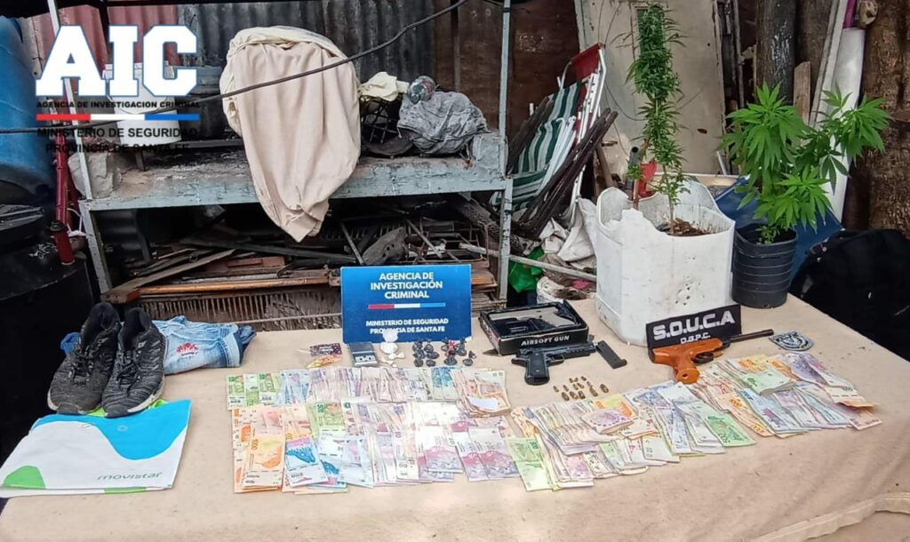 Los agentes secuestraron una pistola de aire comprimido calibre 5.5 mm; una réplica de pistola 9 mm con cargador, una pistola de airsoft, prendas de vestir similares a las utilizadas por el autor del hecho según registros fílmicos; una bolsa ecológica similar a la que utilizó el autor para retirarse con las pertenencias robadas; 5 cartuchos calibre 22 largo; tres cartuchos calibre 22 corto; dos cartuchos calibre 9×19; un cartucho calibre 32; un cartucho calibre 40; una vaina servida calibre 9×19; 12 bolsas con marihuana; 4 bolsas de cocaína; dos plantas de marihuana; anotaciones de venta de los estupefacientes, una balanza de precisión y dinero: $105.090.