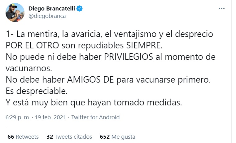 En un segundo ítem afirmó: “Ginés le faltó el respeto a millones de Argentinos que tienen la vacuna como esperanza. Está bien que deje su lugar”. Pero agregó: “también es repudiable el accionar del ‘Periodista’. Si sos una persona honesta, esperás tu turno y no lo hacés por acomodo”.
