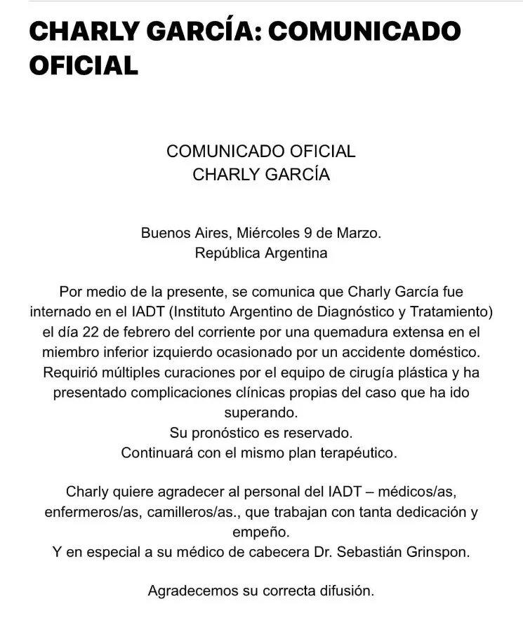 Charly García fue internado el pasado lunes en el Instituto Argentino de Diagnóstico y Tratamiento por una quemadura en una de sus piernas. Dos días después de su ingreso, el establecimiento dio a conocer el primer parte médico del artista.