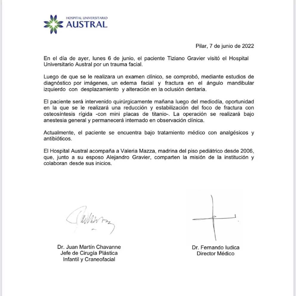Por otro lado, el comunicado manifiesta: “Actualmente, el paciente se encuentra bajo tratamiento médico con analgésicos y antibióticos. El Hospital Austral acompaña a Valeria Mazza, madrina del piso pediátrico desde 2006, que, junto a su esposo Alejandro Gravier, comparten la misión de la institución y colaboran desde sus inicios”, cierra el comunicado oficial que brindó el Hospital.