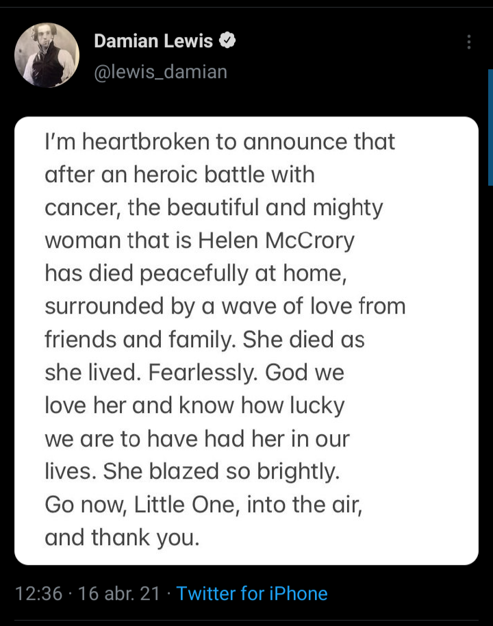 “Desconsolado anuncio que luego de una heroica batalla contra el cáncer, la hermosa y poderosa mujer que es Helen McCrory ha muerto pacíficamente en casa rodeada de una ola de amor de amigos y familia”, anunció el actor en un comunicado que público en su cuenta de Twitter.