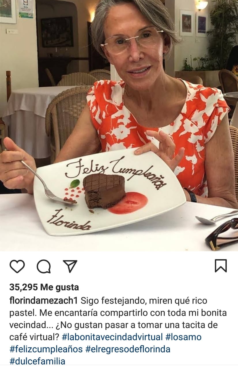 Con motivo de su cumpleaños, la actriz mexicana Florinda Meza, quien interpretó a Doña Florinda en el “Chavo del 8”, decidió compartir en su Instagram, donde tiene más de 180 mil personas que la siguen, una foto en la que se la ve sin maquillaje. “Sigo festejando, miren qué rico pastel. Me encantaría compartirlo con toda mi bonita vecindad… ¿No gustan pasar a tomar una tacita de café virtual?”, escribió junto a la imagen, haciendo alusión a una de sus célebres frases en la serie.