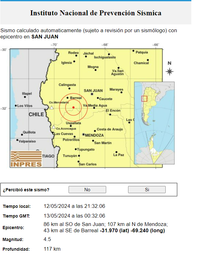 El primer movimiento se registró a las 21.32 en San Juan y tuvo una magnitud de 4,5 grados, en la escala de Richter.