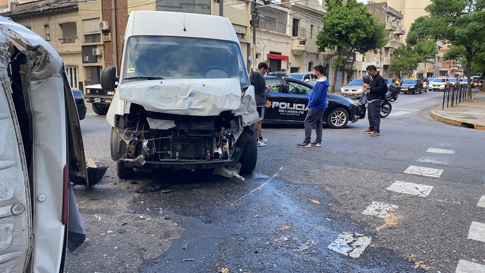 Uno de los vehículos pertenece a una empresa de transporte fue el que terminó dado vuelta y en ese momento estaba ocupado por el conductor y dos personas más. Por su parte, según testigos, el otro rodado cruzó en rojo a alta velocidad.