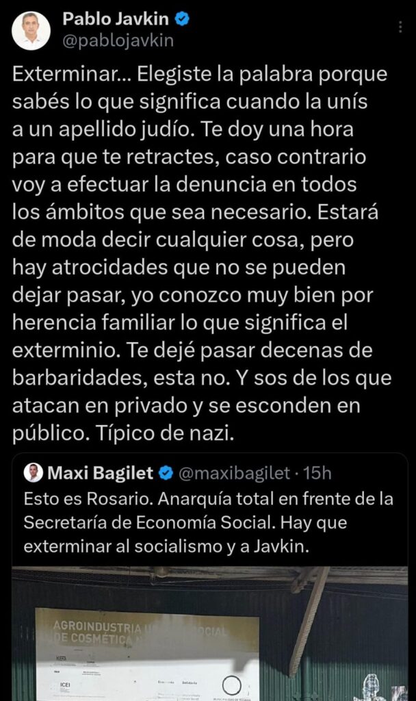El intendente de Rosario respondió hoy en su cuenta de X al precandidato a concejal Maxi Bagilet, de Ciudad Liberal, que había pedido esta mañana “exterminar a Javkin y al socialismo” en un mensaje por la misma red social. “Te doy una hora para que te retractes y si no te voy a denunciar”, le contestó el titular del Palacio de los Leones. Y agregó: “Exterminar… Elegiste la palabra porque sabés lo que significa cuando la unís a un apellido judío”.