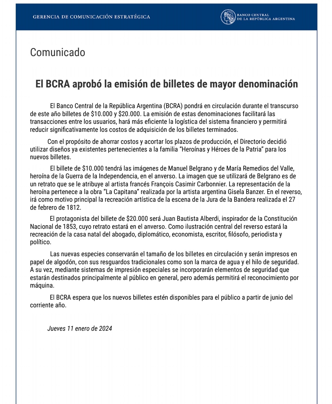 Según se indicó, el billete de $10.000 tendrá las imágenes de Manuel Belgrano y de María Remedios del Valle, heroína de las guerras de Independencia. En el de $20.000 estará la imagen de Juan Bautista Alberdi, la persona más admirada por el presidente Javier Milei.
