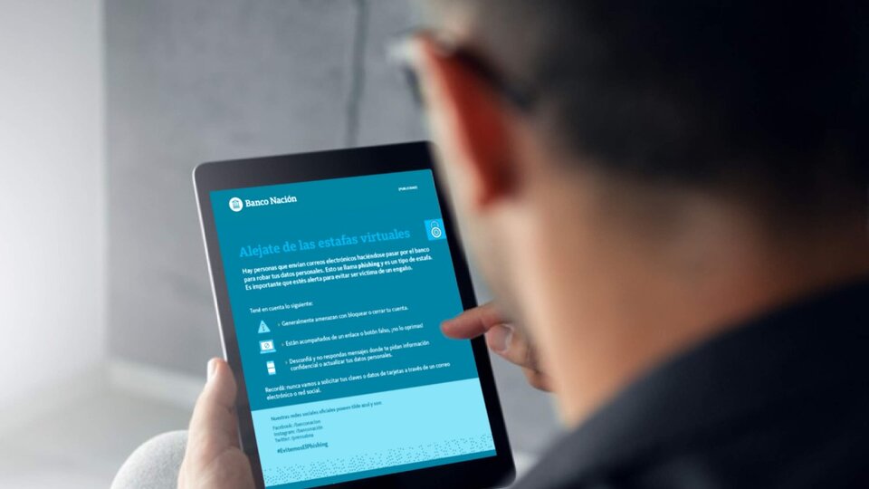 A través de su cuenta de Instagram, la propia institución bancaria publicó un instructivo para no caer en las estafas virtuales. “Hay personas que envían correos haciéndose pasar por el banco para robar tus datos personales. Esto se llama phishing y es un tipo de estafa”, precisaron. Tras explicar cómo se generan estos engaños, desde el Banco Nación aconsejaron “leer con atención y prisa” los mensajes, para poder identificar el fraude.