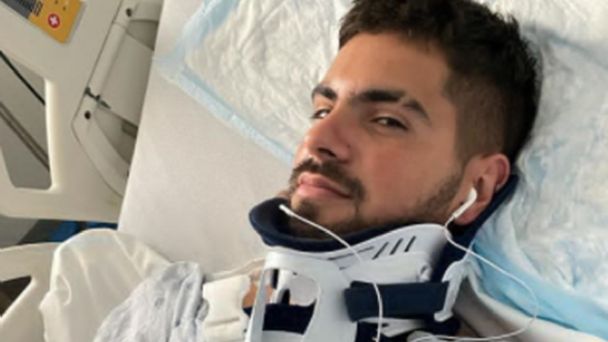 “Se la pegó fuerte contra un poste”, reveló Ángel de Brito en Los Ángeles de la Mañana. Con una foto desde el hospital, con cuello ortopédico y auriculares, el músico posó para las cámaras y les llevó tranquilidad a sus seguidores.