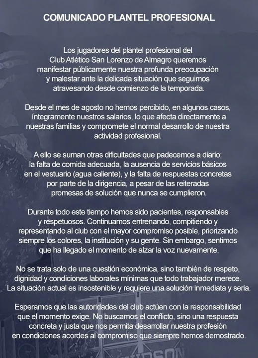 Los jugadores de San Lorenzo realizaron un fuerte comunicado en el que expresaron su “preocupación y malestar” y subrayaron que “llegó el momento de alzar la voz”.