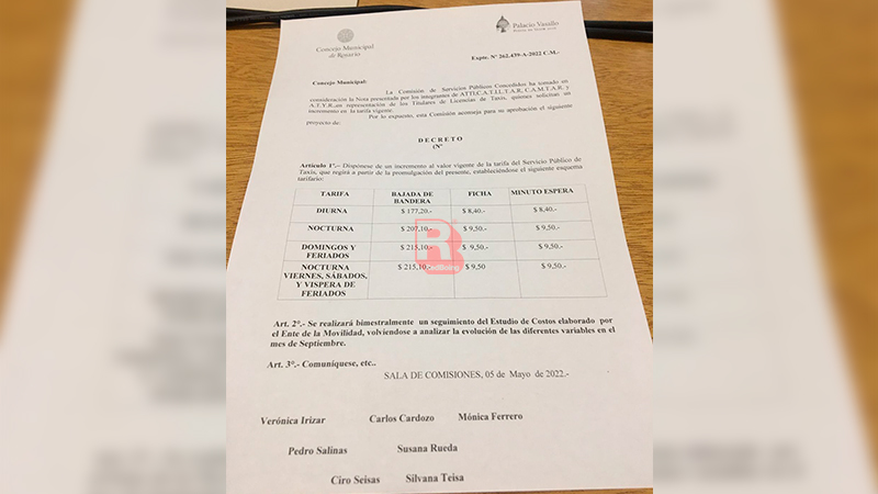 De este modo, con el 35% y 36% que brindaron desde el Palacio Vasallo, los precios se irían a: 177,20 pesos la bajada de bandera diurna y 8,40 pesos la ficha; y $207,10 la bajada de bandera y $9,50 la ficha en la noche.