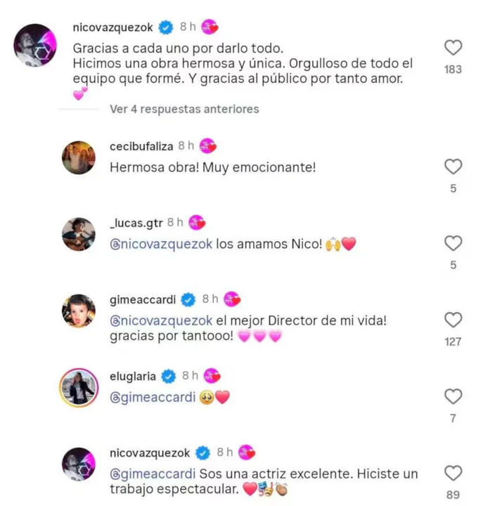 Entre los comentarios, destacó el de Vázquez, quien agradeció al equipo y a su audiencia: “Gracias a cada uno por darlo todo. Hicimos una obra hermosa y única. Orgulloso de todo el equipo que formé. Y gracias al público por tanto amor”.