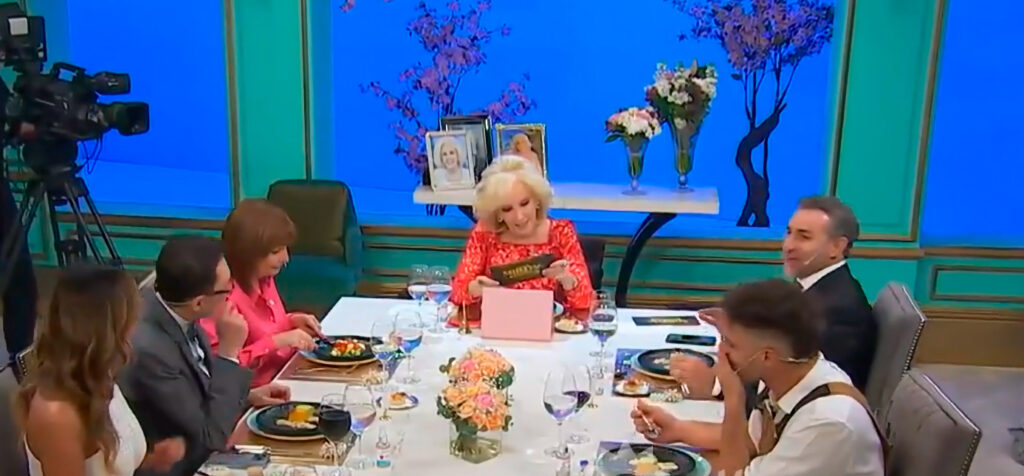 Santi Maratea, intentó esconder su carcajada y se tapó la boca llena de comida. Mientras que Karina Jelinek no se contuvo y aplaudió. Mirtha no ocultó y se rio de su propio chiste.
