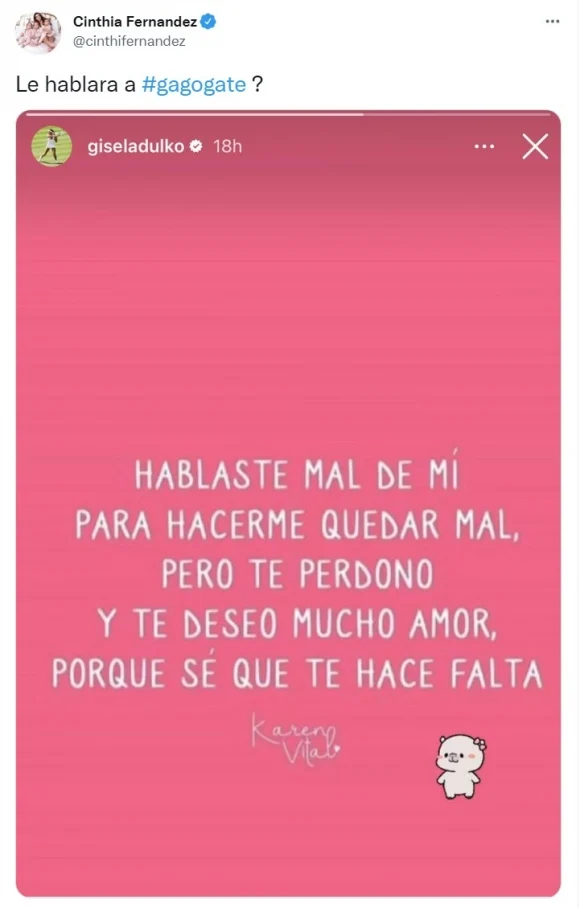Cinthia Fernández, panelista de Momento D, aseguró que el texto tendría que ver con la explosiva separación de la ex pareja, con una tercera en discordia. “¿Le hablará a #Gagogate?”, se preguntó.