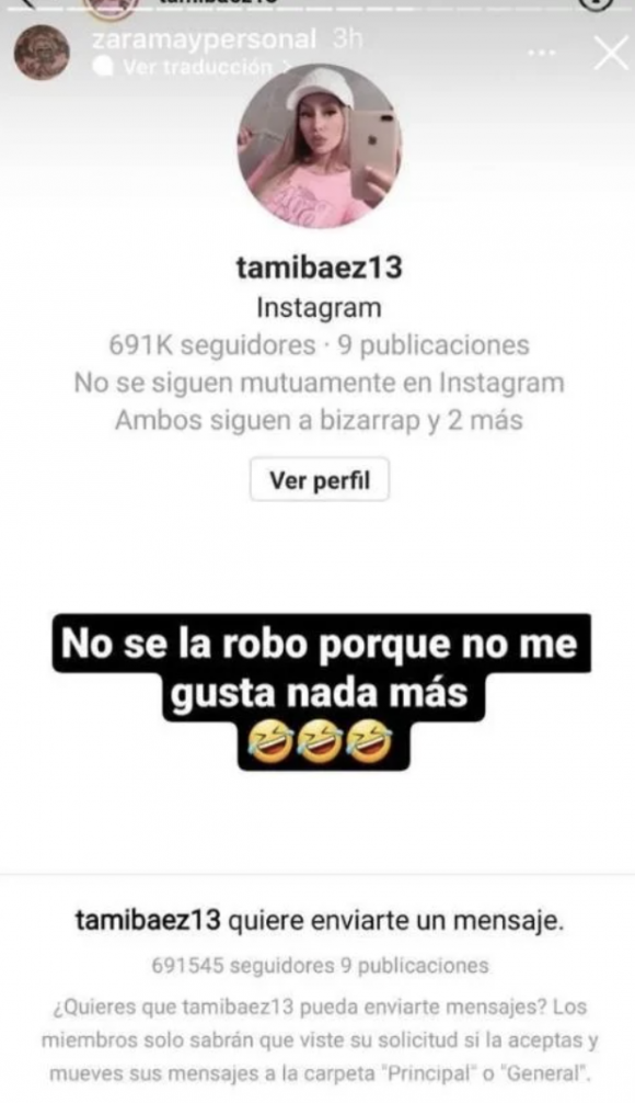 El artista compartió a través de sus stories de Instagram la captura de pantalla de un supuesto mensaje privado que le habría mandado Tamara. Y le sumó a la imagen una apreciación repudiable. “No se la robo porque no me gusta nada más”, sentenció.