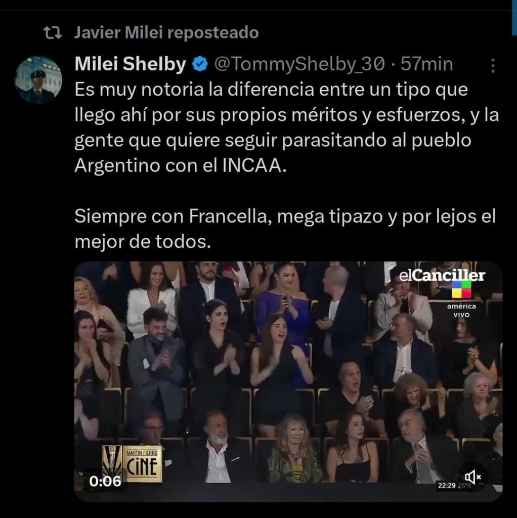 En la mañana del martes, Javier Milei utilizó su cuenta de X para posicionarse en el debate: el presidente de la Nación reposteó uno de los tweets de la cuenta Miley Shelby, bancandoel discurso de Francella: “Es muy notoria la diferencia entre un tipo que llegó ahí por sus propios méritos y esfuerzos, y la gente que quiere seguir parasitando al pueblo argentino con el INCAA”, mencionó el posteo.