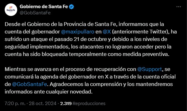 El Gobierno de Santa Fe comunicó, este martes por la tarde, que la cuenta de la red social X del gobernador Maximiliano Pullaro fue bloqueada temporalmente de manera preventiva, tras recibir un ataque el pasado 21 de octubre.