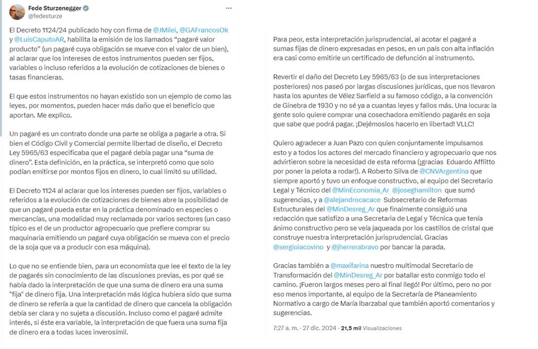 “Un pagaré es un contrato donde una parte se obliga a pagarle a otra. Si bien el Código Civil y Comercial permite libertad de diseño, el Decreto Ley 5965/63 especificaba que el pagaré debía pagar una “suma de dinero”. Esta definición, en la práctica, se interpretó como que solo podían emitirse por montos fijos en dinero, lo cual limitó su utilidad”, explicó el ministro de Desregulación Federico Sturzenegger, en su cuenta de “X”.